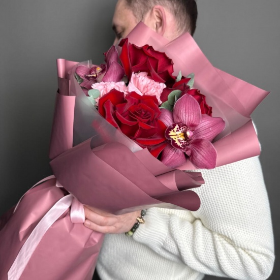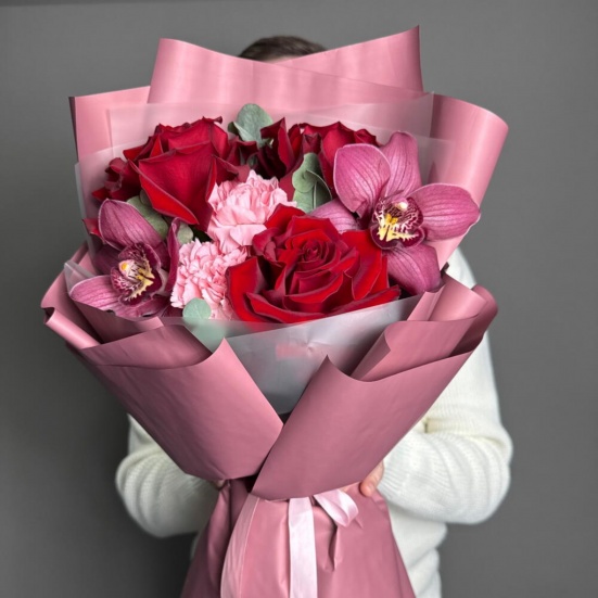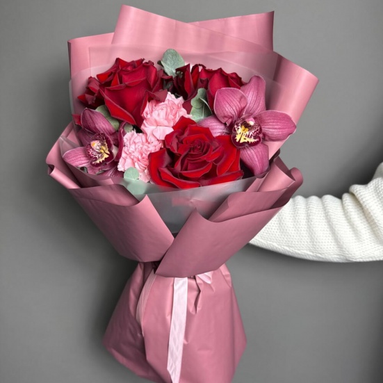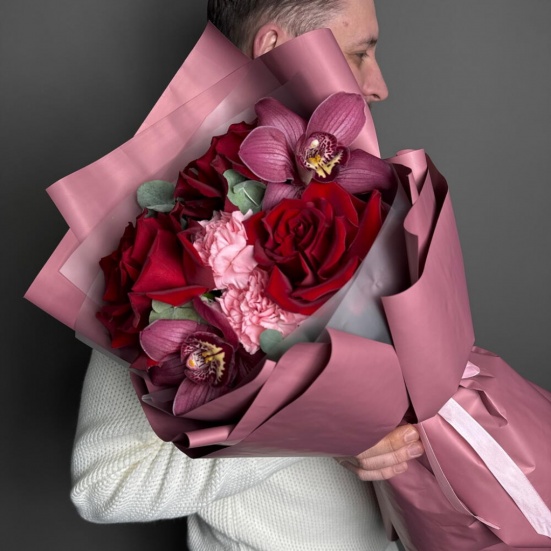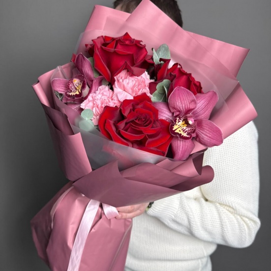 Букет из 3 красных роз, орхидей и диантуса в Балабаново