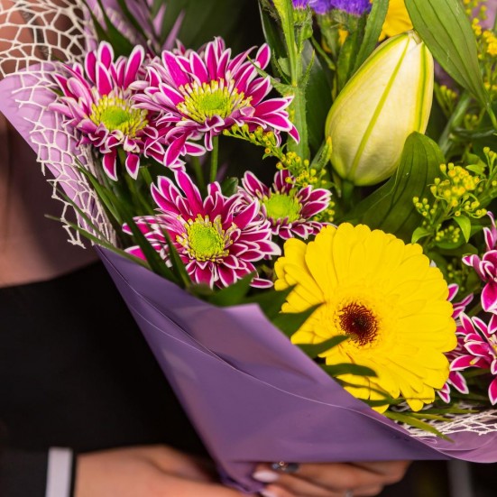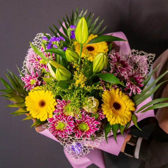 Букет с розами, хризантемами, лилиями, герберами в Балабаново